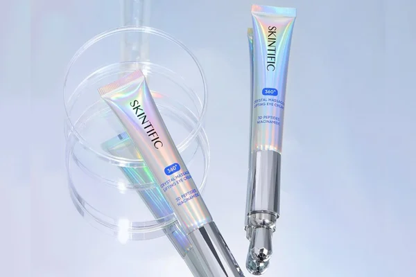 Krim mata yang mengandung peptide dan niacinamide yang bisa mengurangi garis halus, kerutan, dan lingkaran hitam di bawah mata.