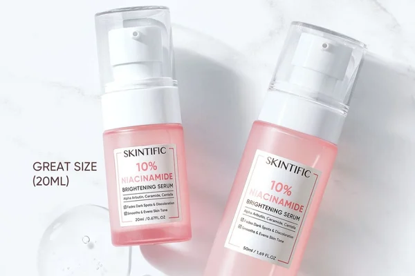 Serum yang mengandung niacinamide yang bisa mencerahkan kulit, memudarkan noda hitam, dan meratakan warna kulit.