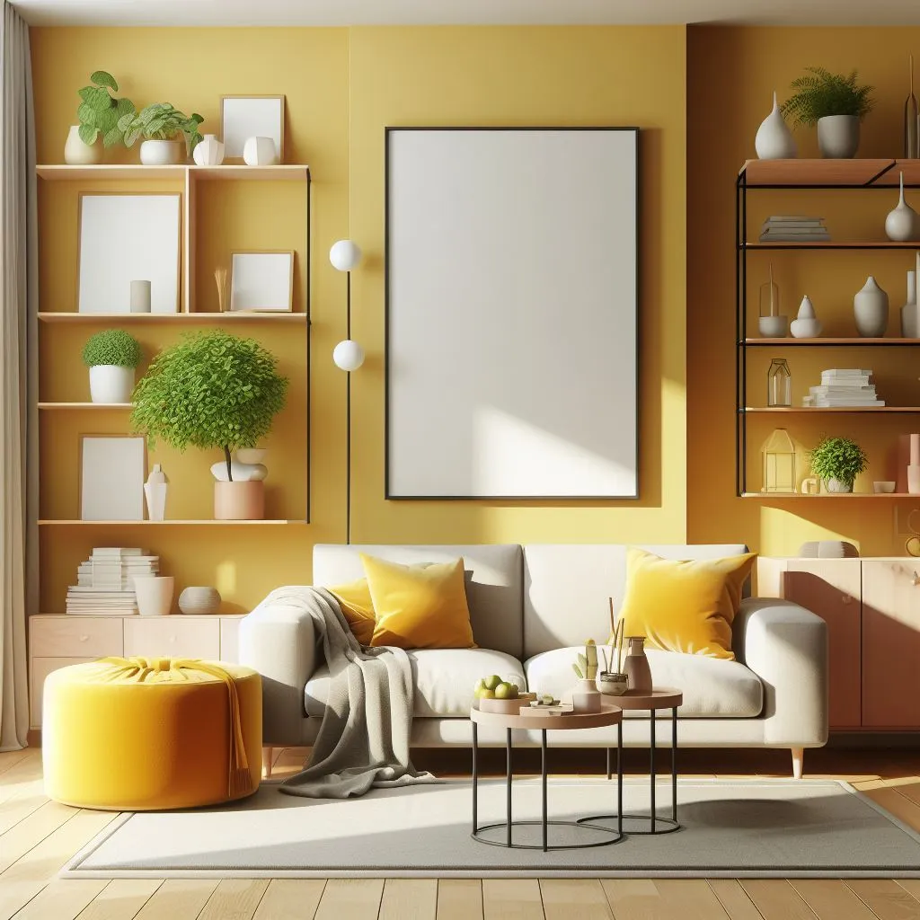 Kita bisa menggunakan warna kuning untuk ruang tamu minimalis kita, baik untuk cat tembok, sofa, karpet, atau aksesori.