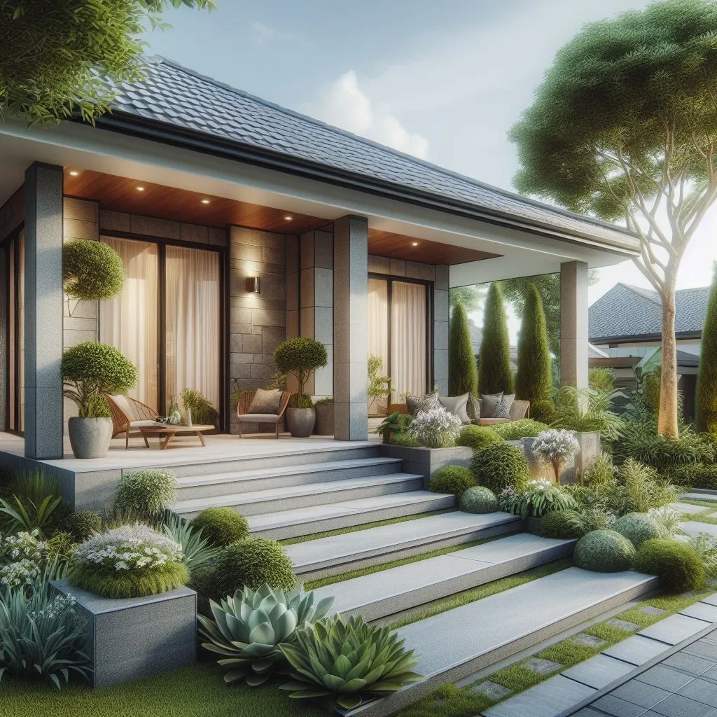Model ketiga adalah teras batu alam setengah badan dengan taman mini. Model ini cocok untuk Anda yang ingin memberikan kesan sejuk dan hijau pada teras Anda.