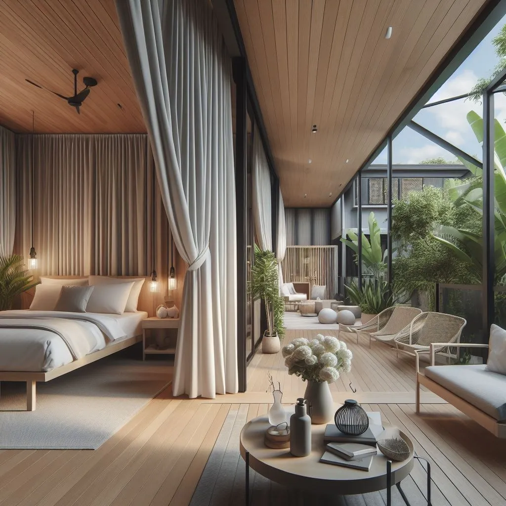 Untuk lantai, Anda bisa menggunakan keramik berwarna kayu atau motif kayu yang simple dan elegan. Anda juga bisa menambahkan karpet berwarna netral atau motif untuk memberikan tekstur dan aksen pada lantai.