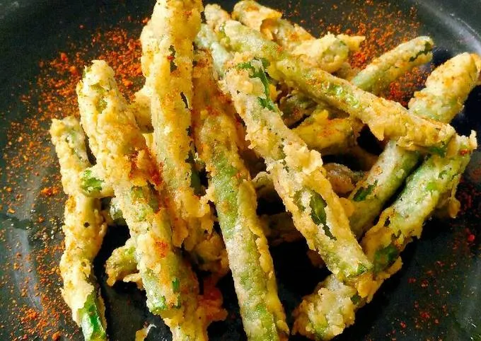 Potong kacang panjang dan celupkan ke dalam adonan tepung berbumbu. Goreng hingga kecoklatan dan renyah.
