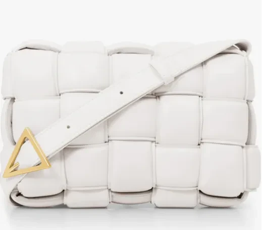 Logo intrecciato ikonik Bottega Veneta masih hadir, namun dengan ukuran yang sedikit lebih kecil dan detail yang lebih halus.