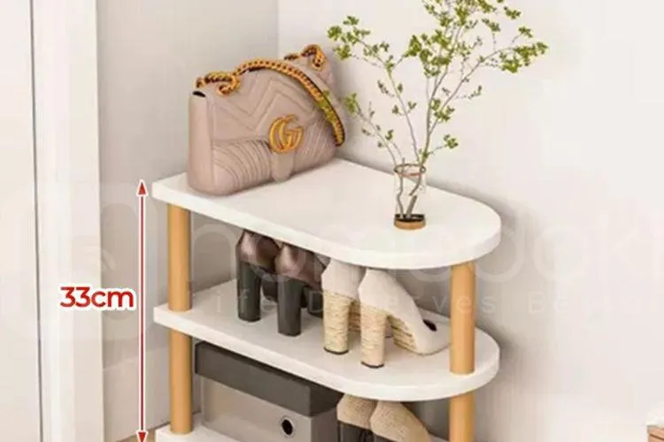 Dengan warna putih yang bersih dan unsur kayu yang hangat, rak ini tidak hanya berfungsi sebagai penyimpanan sepatu tetapi juga sebagai elemen dekoratif yang mempercantik ruangan.