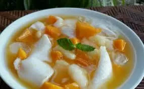 - Siapkan mangkuk saji, masukkan nangka, alpukat, kelapa muda, dan sagu mutiara.