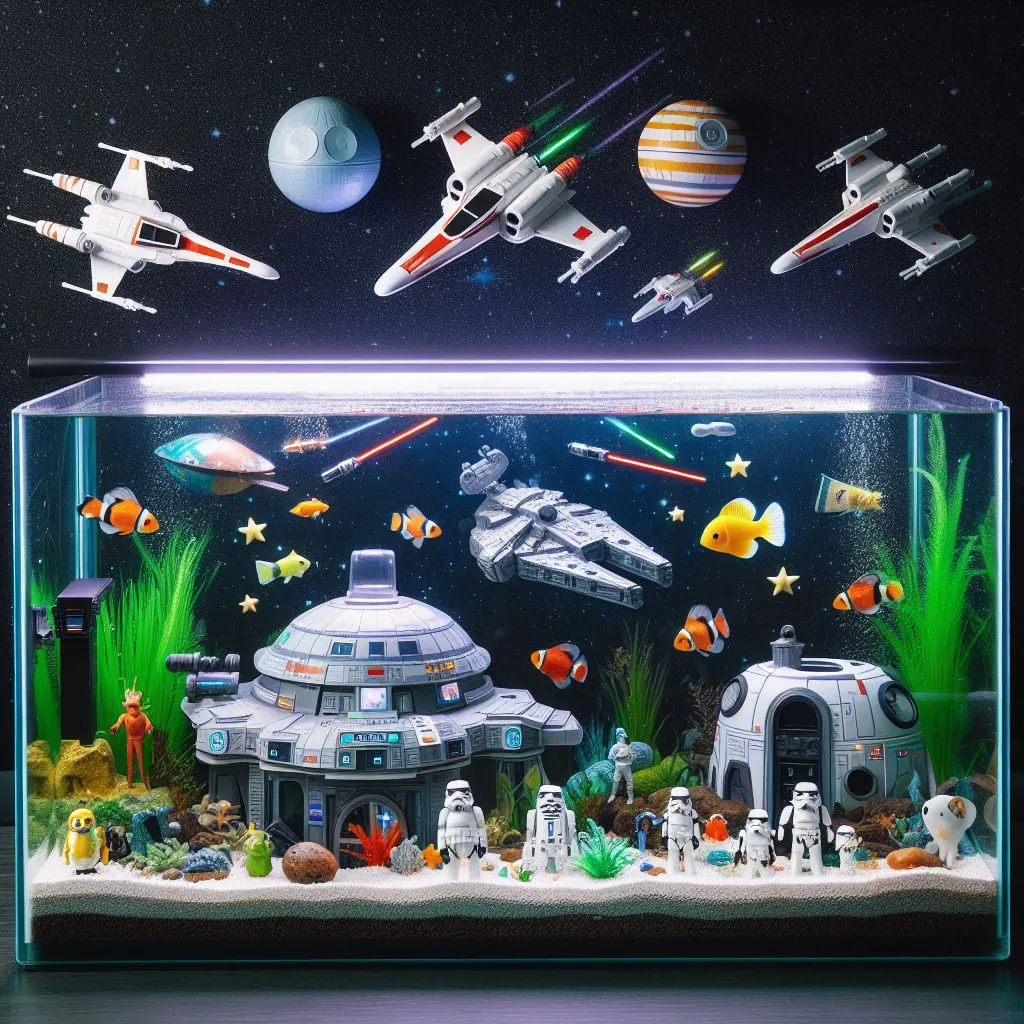 Anda bisa memilih tema yang Anda sukai, misalnya Star Wars, Harry Potter, Marvel, Disney, atau lainnya. Anda bisa menggunakan mainan, action figure, atau hiasan yang berkaitan dengan tema tersebut untuk menghiasi aquarium Anda.