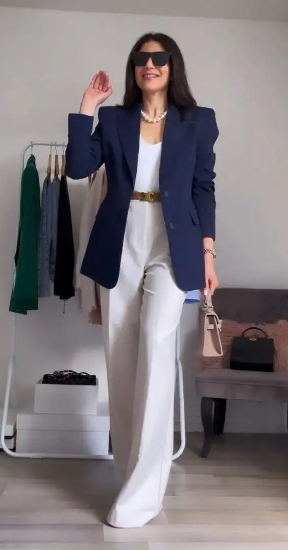 Contoh: Blazer navy dipadukan dengan celana bahan putih dan kemeja polos. - Untuk Gaya Kasual