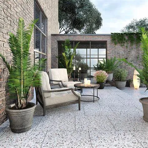 Salah satu cara untuk meningkatkan daya tarik visual teras depan adalah dengan menggunakan batu alam dan keramik yang elegan.