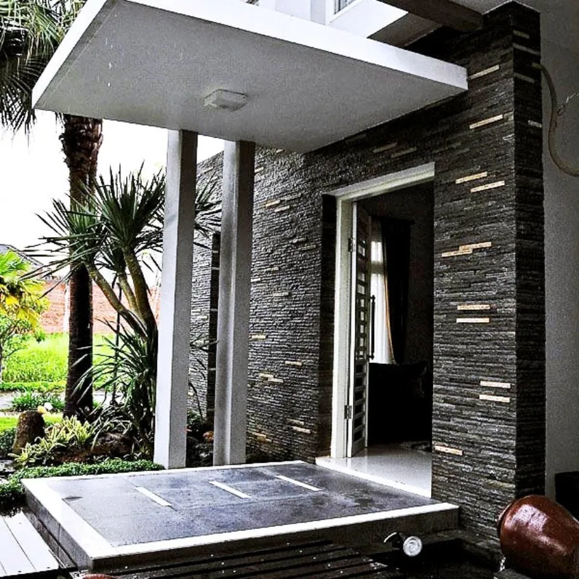 Batu alam palimanan ini warnanya cokelat muda, teksturnya kasar tapi tetap halus di mata. Pas banget buat lo yang pengen teras dengan nuansa hangat dan eksotis.