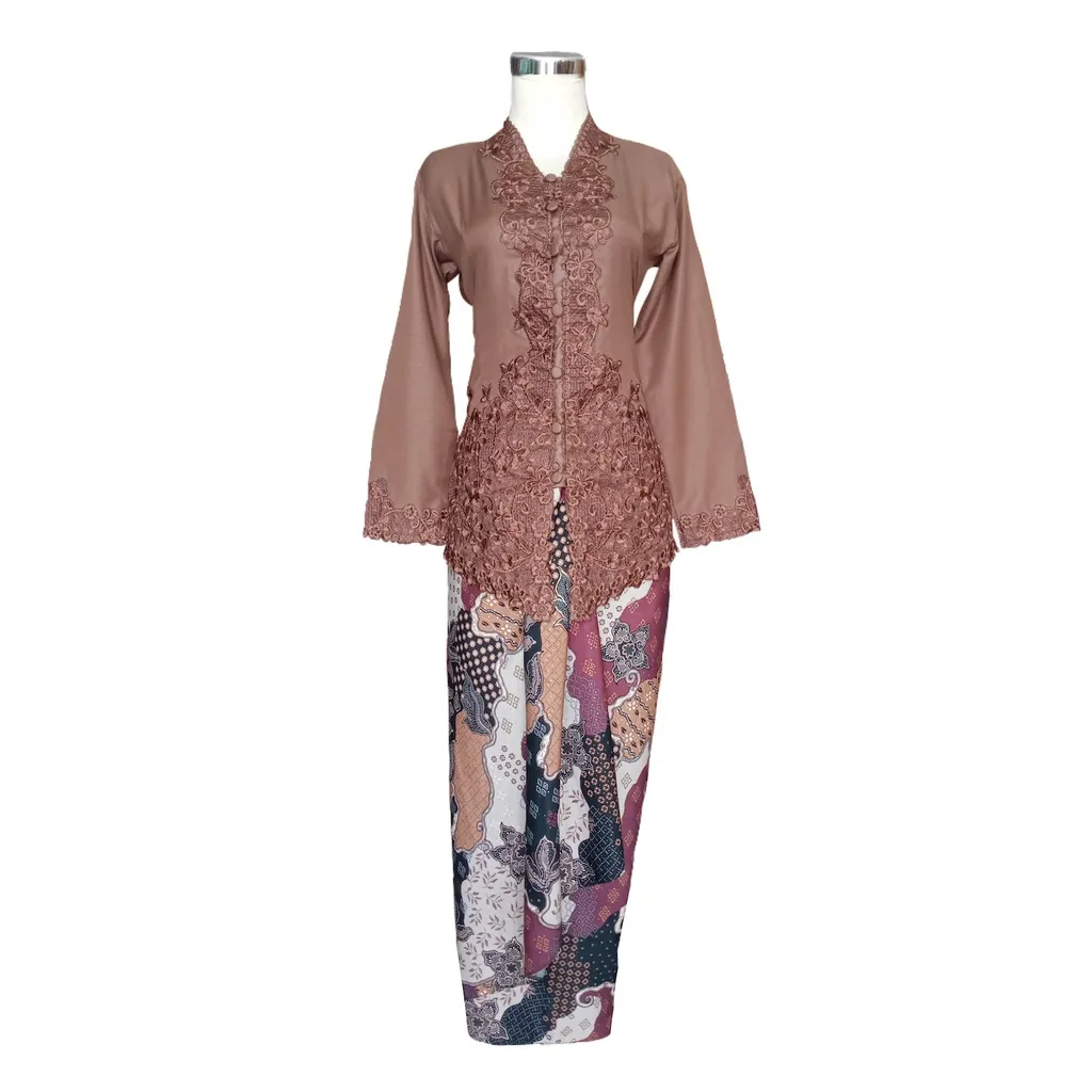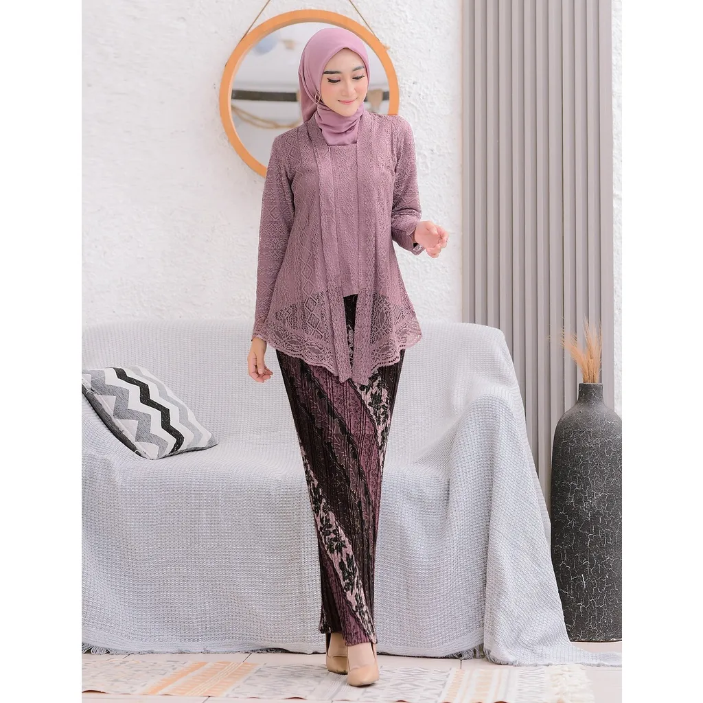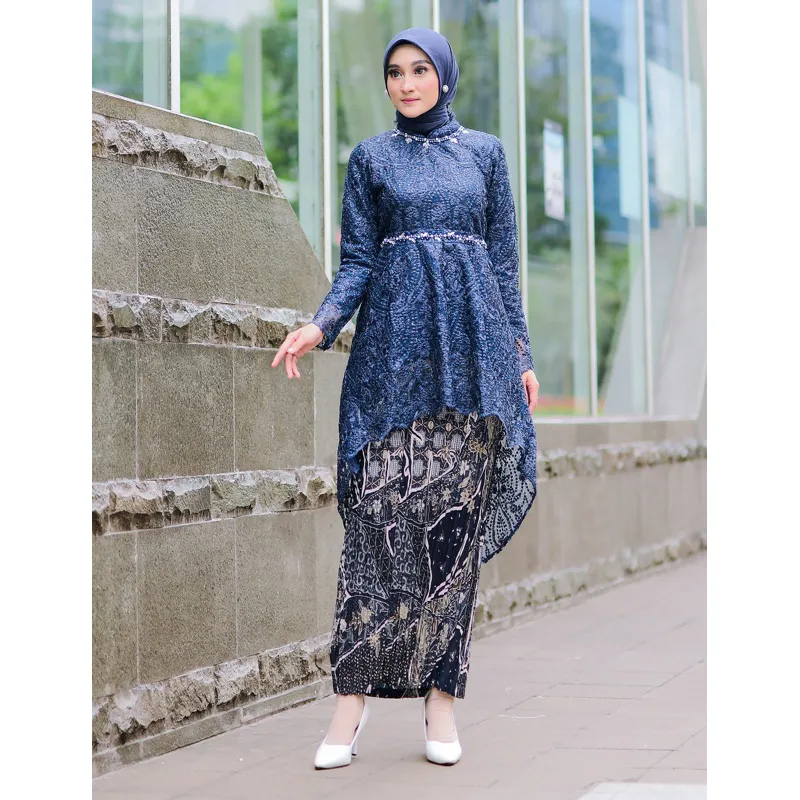 Kebaya dengan potongan asimetris di bagian bawahnya membawa nuansa modern dan berani. Pilih desain dengan detail renda, payet, atau manik-manik untuk menambahkan sentuhan glamor pada penampilan. Padukan dengan kain polos atau motif serupa untuk menciptakan keseimbangan yang harmonis dalam penampilan.