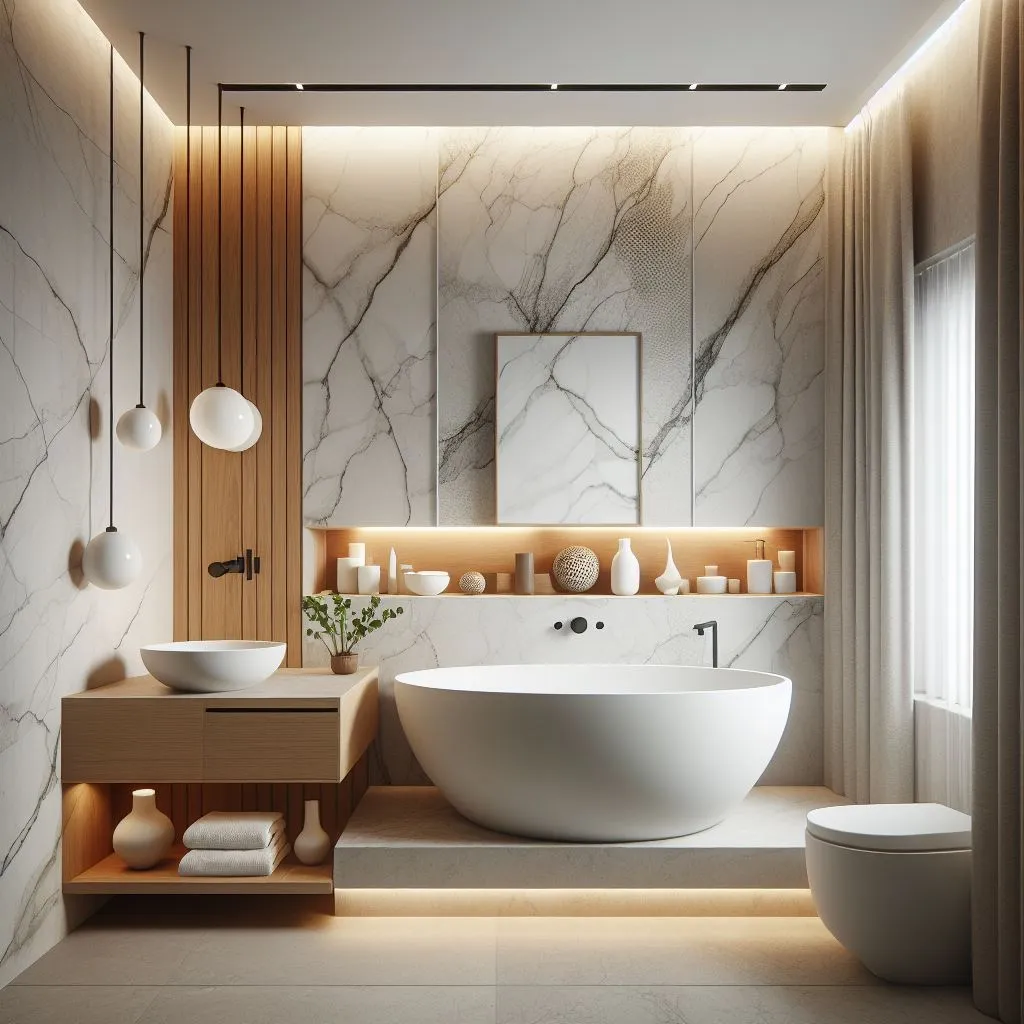 Dinding kamar mandi dilapisi dengan batu alam marmer putih yang memiliki corak halus dan bersinar. Lantai kamar mandi menggunakan keramik motif kayu yang memberikan kesan hangat dan natural.