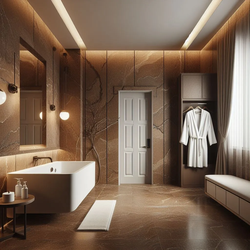 Kamar mandi batu alam klasik. Desain ini menggunakan warna cokelat sebagai warna dominan kamar mandi, yang memberikan kesan klasik dan cozy.