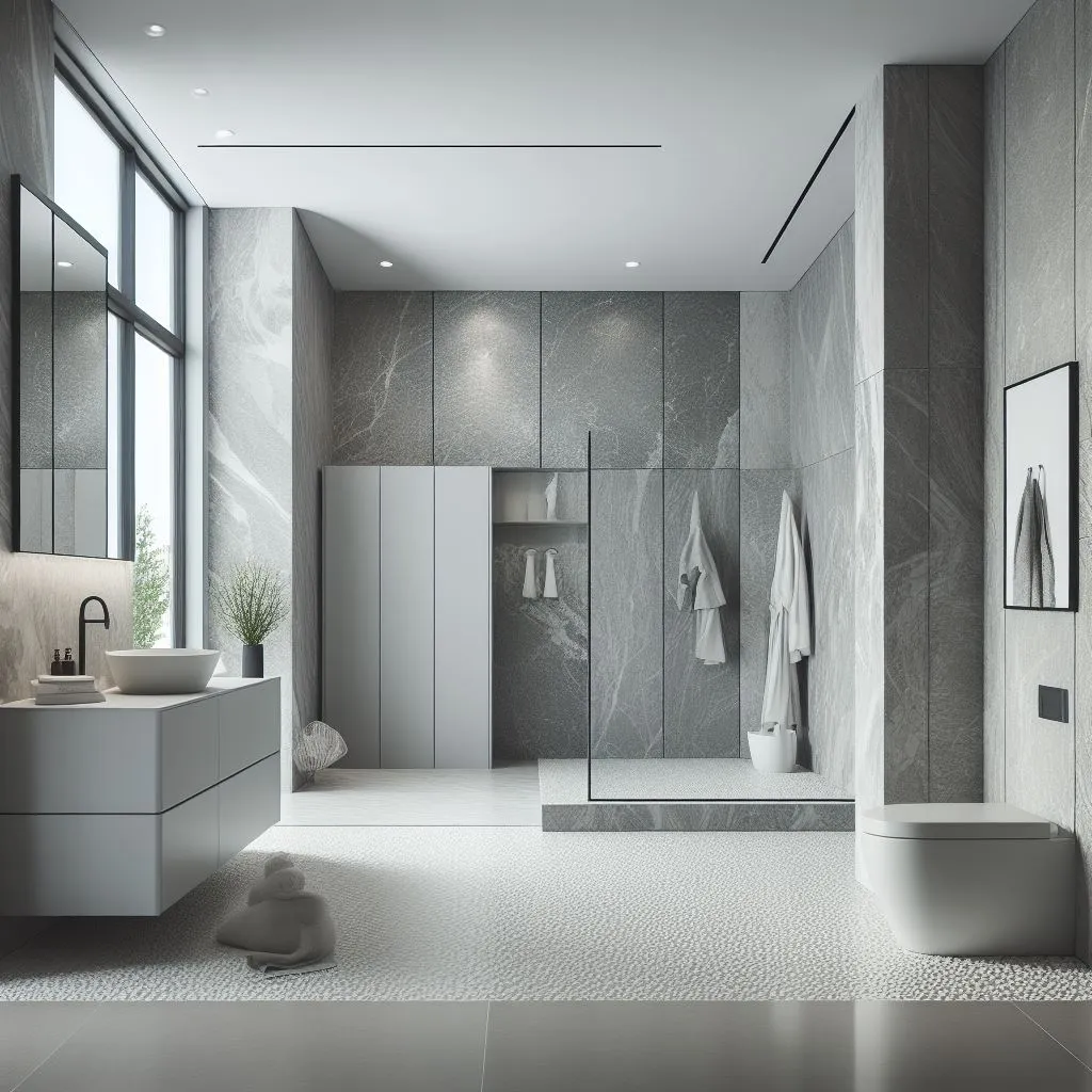 Dinding kamar mandi dilapisi dengan batu alam kuarsit abu-abu yang memiliki corak unik dan berkilau. Lantai kamar mandi menggunakan kerikil batu alam putih yang memberikan kesan alami dan menyegarkan.