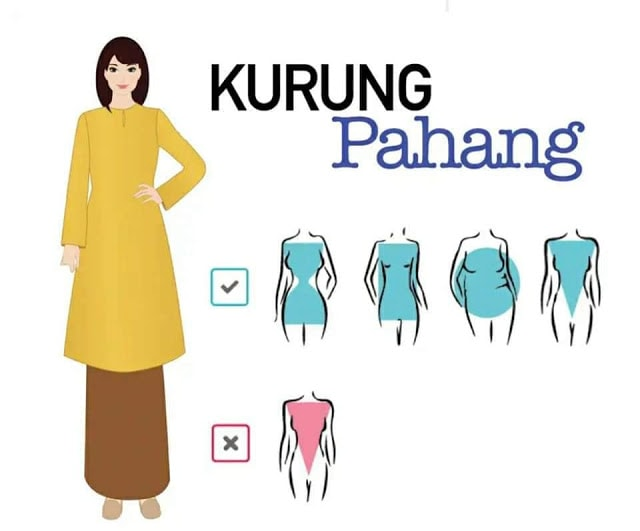 Jika anda memiliki badan yang kurus dan tinggi, anda boleh memilih kurung pahang sebagai pilihan anda. Kurung pahang adalah jenis baju kurung yang kembang di bahagian bawah.