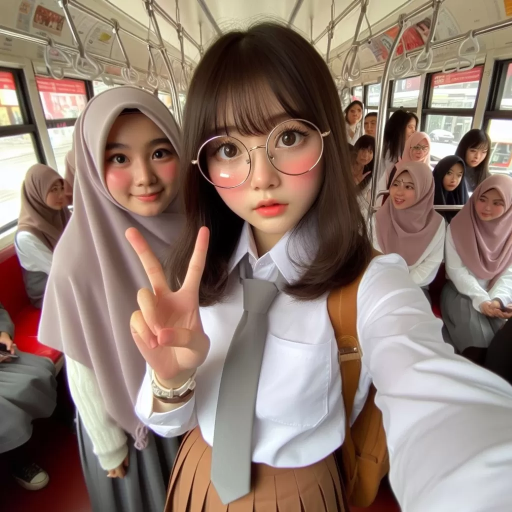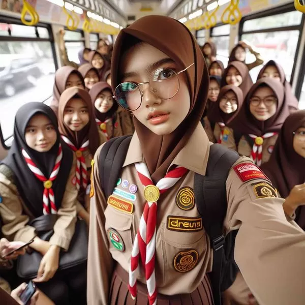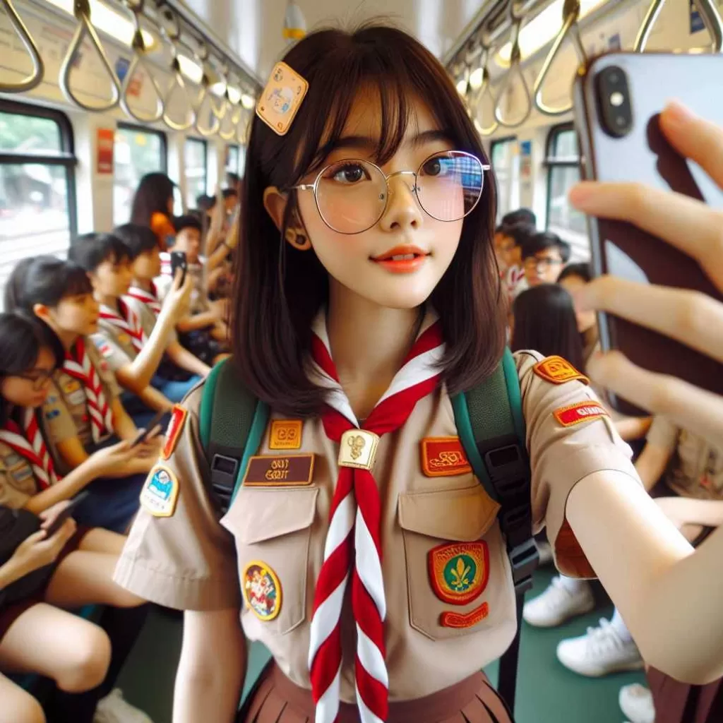 POV left hand Selfie ,Side, Indonesian girl 15 year old, short straight hair style, tied hair, hair clip, round face, detailed face, shiny glasses, wearing Scout outfit, red white tie, brown mini skirt , pantyhose, shoes school, uniform embroidered brown name tag “Your name ” wearing black school bag , standing on the crowded tram, Selfi together with other friends, dept of field