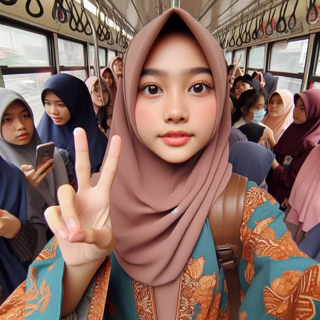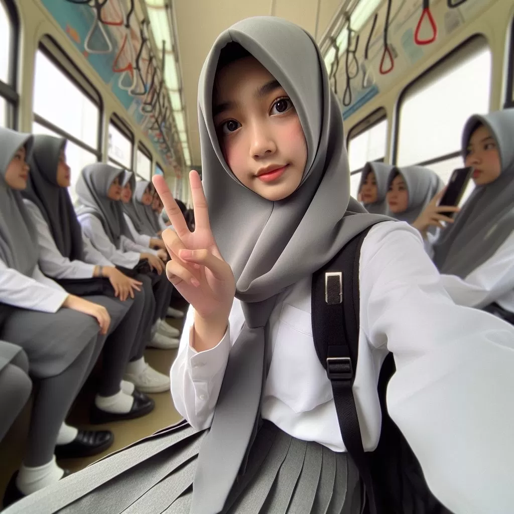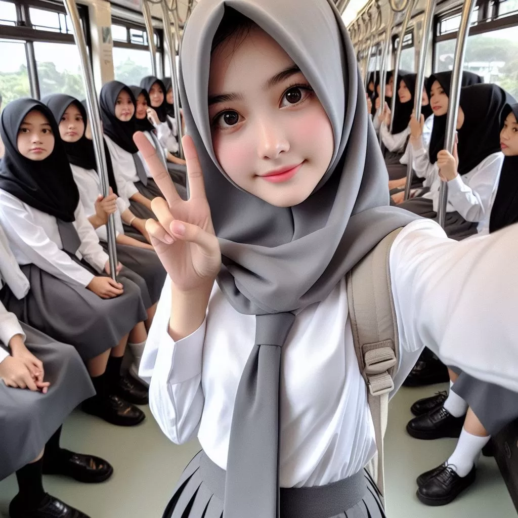 Left hand POV Selfie ,Side, 17 years old Indonesian girl, hijab, round face, detailed face, wearing White Uniform, Gray tie, brown long skirt, stockings, school shoes, , standing on a crowded tram, Selfi with other friends, Department of Field