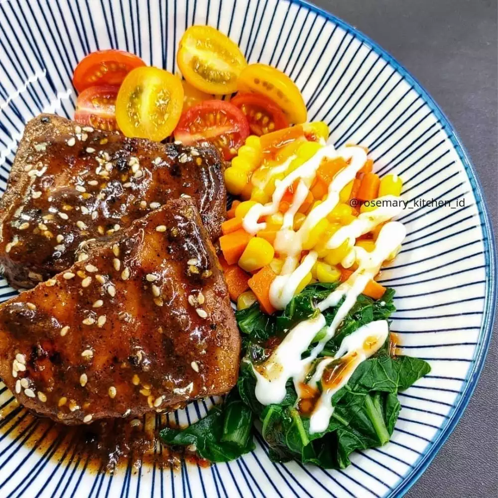 Steak tuna saus wijen ini mudah dibuat, cukup dengan membalur tuna dengan bumbu-bumbu seperti minyak wijen, saus tiram, madu, kecap ikan, bubuk bawang putih, lada hitam, garam, dan gula pasir, lalu dipanggang di oven atau teflon.