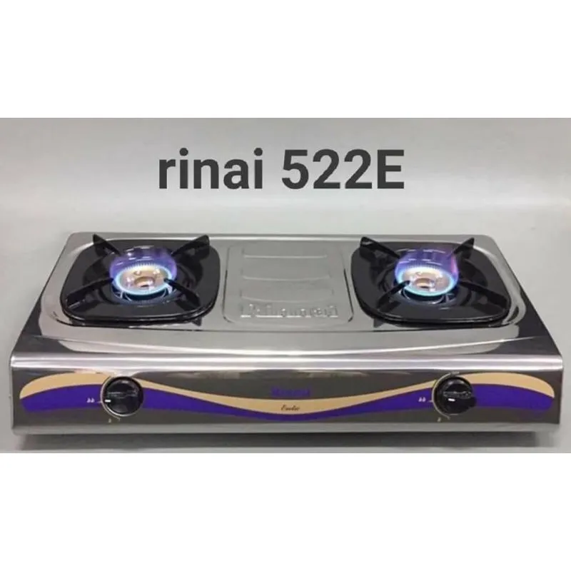 Rinnai 522E juga memiliki dua tungku, namun regulator-nya memiliki warna hijau. Kompor ini menggunakan api ekonomis yang hemat gas dan dapat membuat masakan matang merata dengan hasil yang sempurna.