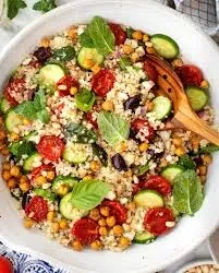 Pada jam makan siang, saat kita ingin sesuatu yang ringan namun memuaskan, salad quinoa Mediterania adalah pilihan yang sempurna. Quinoa adalah sumber protein nabati yang kaya akan asam amino esensial, serta serat dan zat besi.