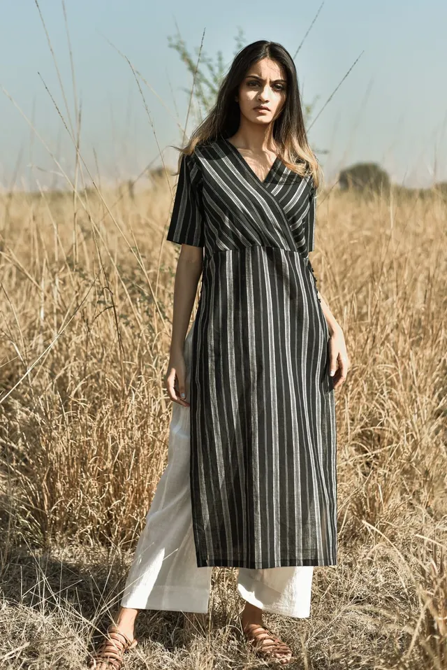 Tatanan kain lurik yang vertikal dan horizontal menambah dimensi menarik pada dress ini.