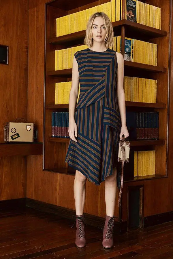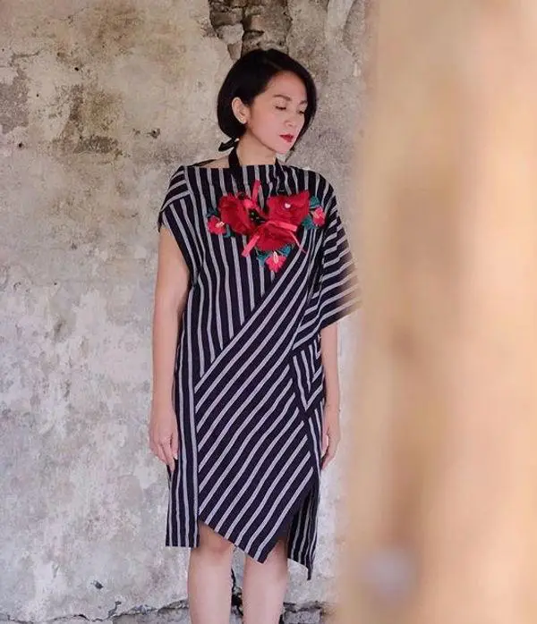 Dress lurik tanpa lengan dengan potongan lurus ini dimodifikasi dengan pola asimetris.