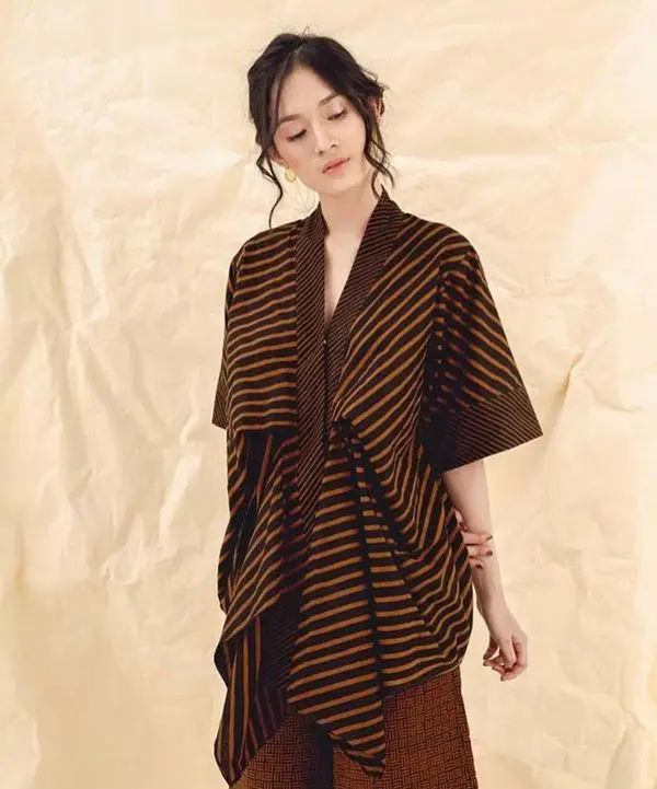 Model baju lurik yang satu ini memang terinspirasi dari sayap kelelawar. Dengan potongan V-neck dan lengan yang lebar sepanjang siku, baju ini memberikan kesan dramatis yang menawan.
