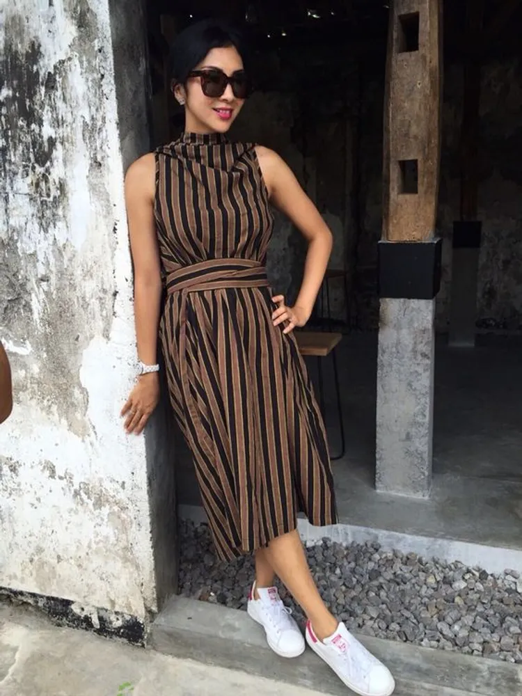 Dress lurik tanpa lengan dengan aksen belt di pinggang, memberikan siluet yang anggun.