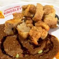 Batagor Kingsley merupakan hidangan khas Bandung yang terbuat dari adonan bakso ikan dan tahu goreng yang disiram dengan bumbu kacang kental dan pedas. Perpaduan tekstur yang renyah dan rasa yang gurih pedas membuat hidangan ini digemari banyak orang.